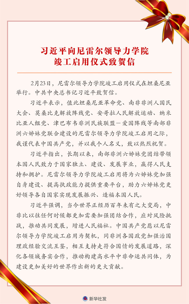 Як зазначив Сі Цзіньпін, КПК готова скористатися відкриттям Школи лідерства Джуліуса Ньєрере, як можливістю для активізації обміну досвідом у галузі державного управління з різними африканськими партіями, для взаємної підтримки у пошуку шляхів розвитку, що відповідають реаліям кожної з країн, для поглиблення практичної співпраці у всіх галузях, для сприяння формуванню китайсько-африканської спільноти єдиної долі високого рівня та для нового внеску у побудову кращого світу.