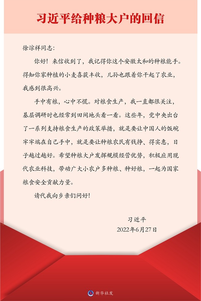 Сі Цзіньпін, який є також генеральним секретарем ЦК КПК і головою Центральної військової ради, зробив цю заяву в понеділок у листі у відповідь Сюй Цунсяну, досвідченому фермеру, який займається вирощуванням зерна в селі Чжанхуай повіту Тайхе /пров. Аньхуей/.