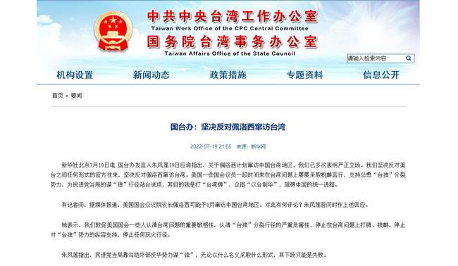 Офіційний представник Канцелярії Держради КНР у справах Тайваню Чжу Фенлянь заявила рішучий протест у зв'язку із планом спікера Палати представників Конгресу США Ненсі Пелосі відвідати китайський Тайвань.