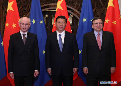 Сі Цзіньпін зазначив, що в якості найбільшої країни, що розвивається і найбільшої у світі спільноти розвинутих держав Китай і ЄС залишаються "двома провідними силами" для захисту миру на планеті. В якості двох важливих економік світу Китай і ЄС є "двома великими ринками", які сприяють спільному розвитку. Будучи важливими колисками східної та західної культур, Китай і ЄС є "двома великими цивілізаціями", що сприяють прогресу людства. На 3-му пленумі ЦК КПК 18-го скликання була розроблена комплексна програма з всебічного поглиблення реформ, країна просувається шляхом великого відродження китайської нації. Європейська інтеграція також стала мрією народів європейських країн, що прагнуть до довготривалого миру і процвітання протягом кількох століть. Сторони повинні поважати і підтримувати один одного, ставитися один до одного на основі рівноправності. Китай буде і надалі твердо підтримувати будівництво європейської інтеграції. Сторони повинні точно визначити китайсько-європейські всебічні відносини стратегічного партнерства, здійснити інноваційний розвиток в китайсько-європейському співробітництві, принести користь народам двох країн і зробити більший внесок у забезпечення миру і розвитку в усьому світі.