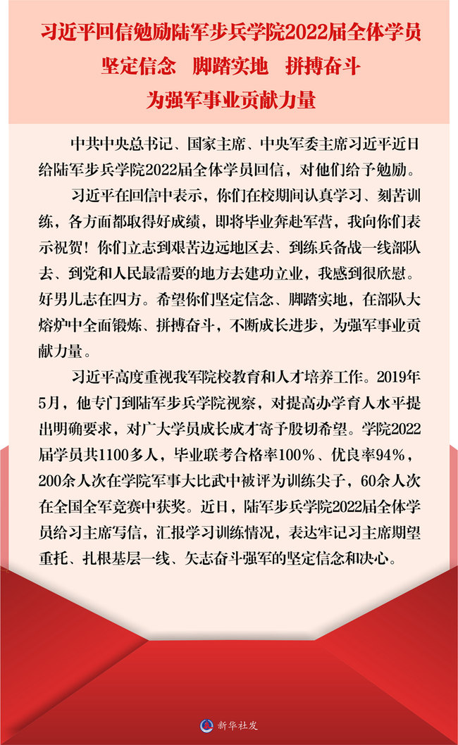 Майбутні випускники нещодавно написали лист Сі Цзіньпіну, в якому повідомили про свої успіхи у навчанні та підготовці, а також висловили рішучість служити у військових підрозділах низового рівня та докладати зусиль на благо зміцнення збройних сил країни.